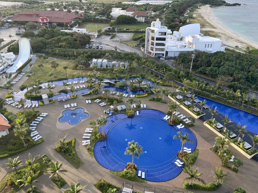 今回宿泊したのはグランドメルキュール沖縄残波岬というホテルです。外のプールが温水で冬でも入れるというのが決め手でした。プールの中は温かいのですが、外に出るとさすがに寒かったですね。毎日プールに入って、凍えながらスライダーに乗ったりして楽しかったです。