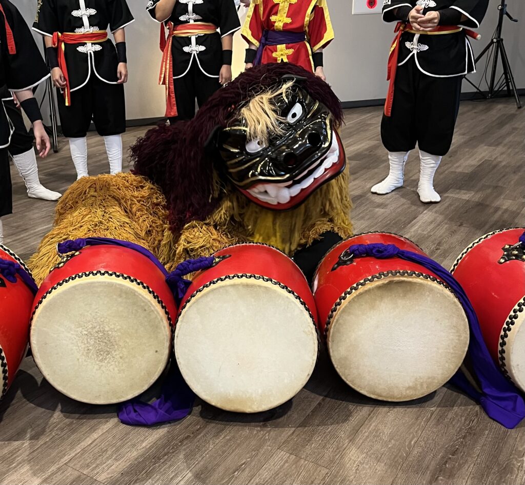 元旦には太鼓のショーや獅子舞いのイベントがありました。沖縄の獅子舞いの髪の毛?は紅芋タルトのような色をしていて、かわいかったです。一緒に記念写真も撮りましたので、幸運が訪れるとよいですね。